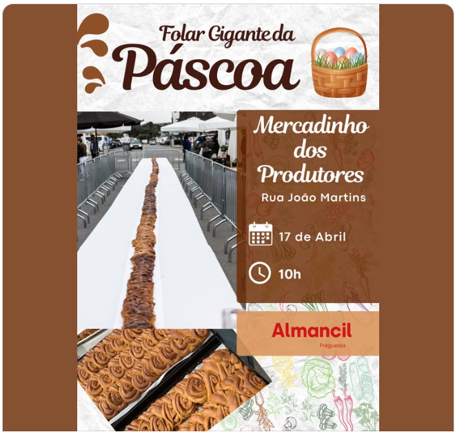 Hoje, 17 de abril, a partir das 10h00, Almancil vai ser palco de um doce momento pascal com a apresentação de um Folar Gigante de 50 metros, no Mercadinho dos Produtores, situado na Rua João Martins.