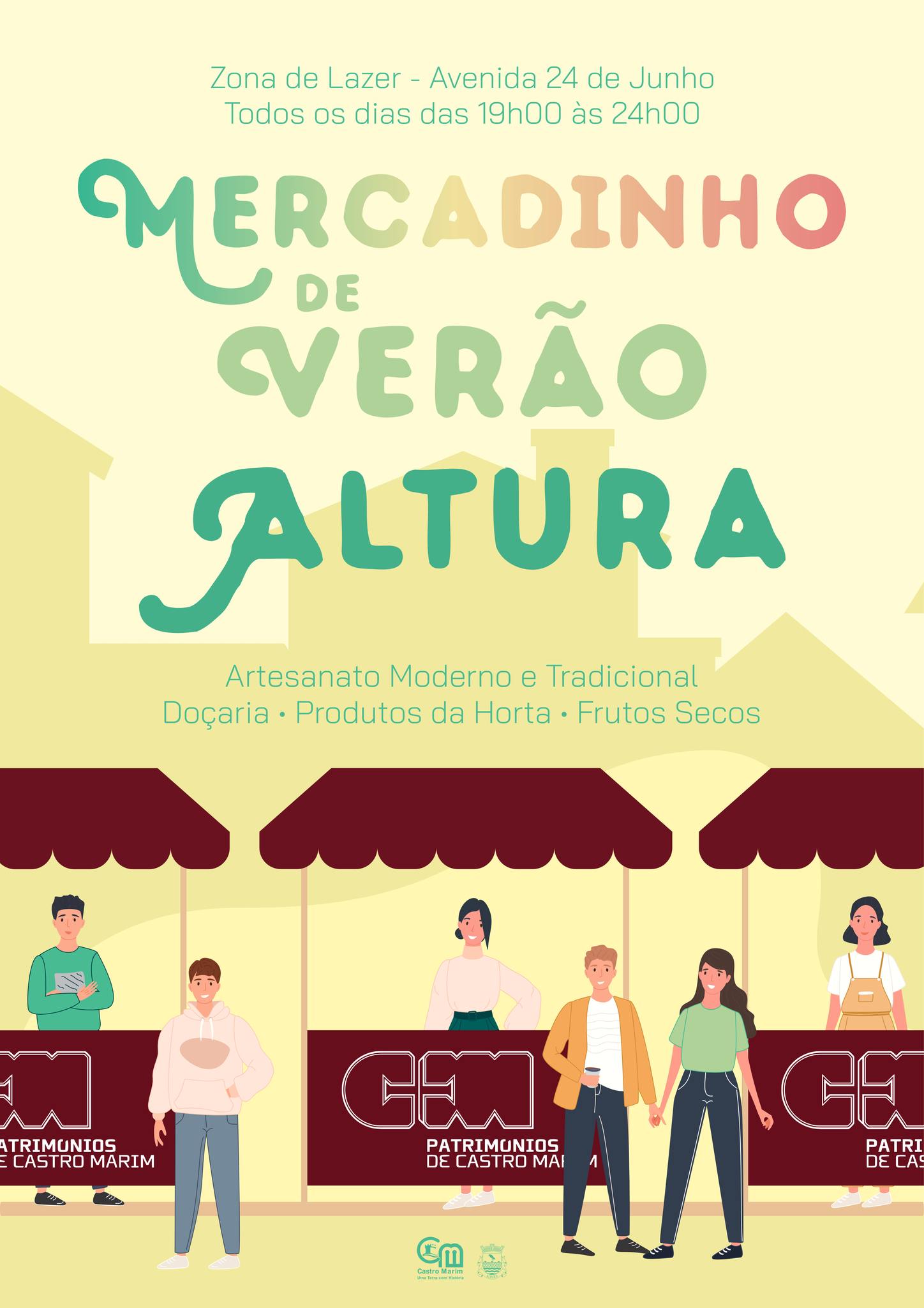 Os tradicionais mercadinhos de Altura também estão de volta a partir de sexta-feira, dia 12 de julho, diariamente entre as 19h00 e as 00h00, com os melhores produtos e iguarias locais como o mel, frutos secos, sal, flor de sal, doçaria, artesanato e produtos hortícolas.