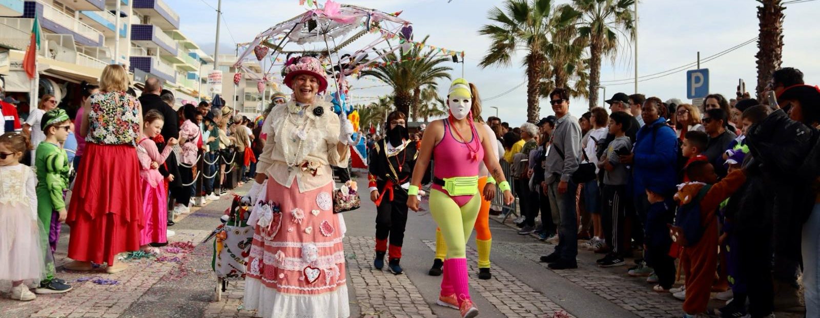 O Carnaval de Quarteira do dia 13 de fevereiro, ao longo da Avenida Infante Sagres, com o corso carnavalesco.