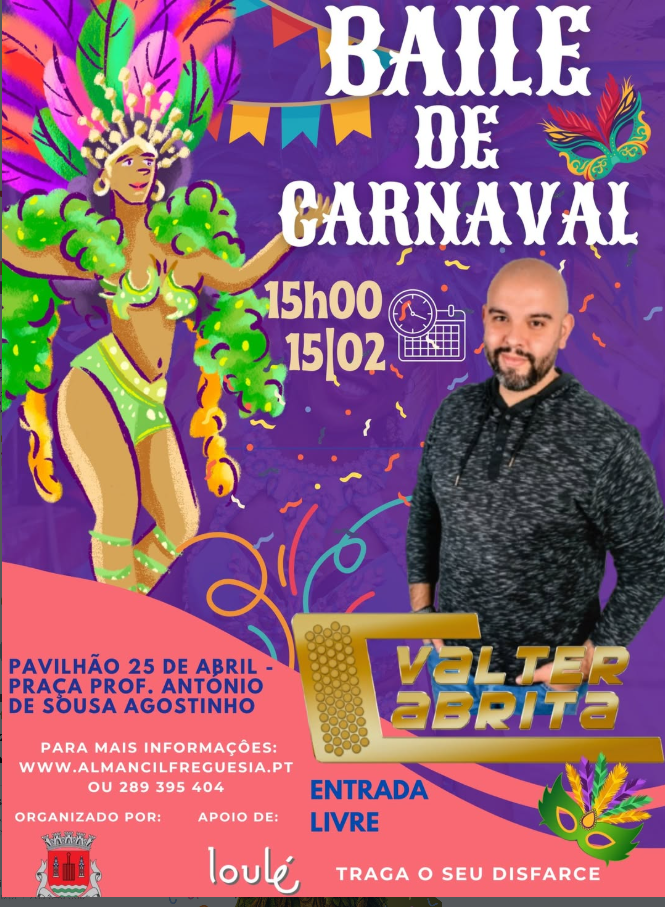 O espírito do Carnaval chega a Almancil com um animado Baile de Carnaval, prometendo uma tarde cheia de cor, música e boa disposição. O evento realiza-se no dia 15 de fevereiro, a partir das 15h00, no Pavilhão 25 de Abril, situado na Praça Professor António de Sousa Agostinho.
