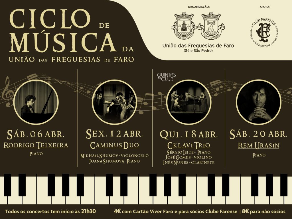 A União das Freguesias de Faro vai levar a efeito um Ciclo de Recitais de Música, a ter lugar nas noites de 6 de abril (sábado), 12 (sexta-feira) e 18 (quinta-feira) e 20 (sábado), sempre às 21h30, no Club Farense (Rua de Santo António).