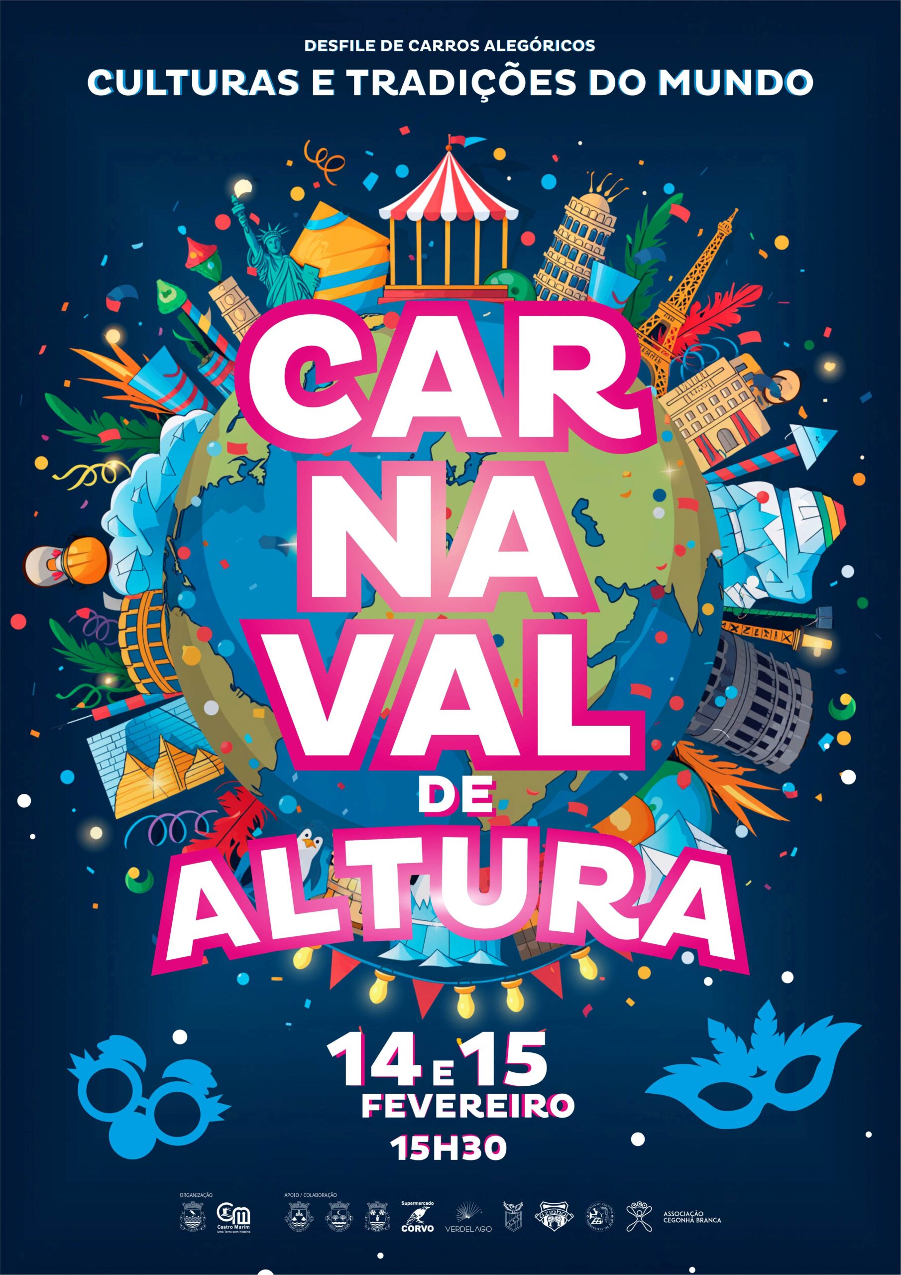 A edição deste ano do Carnaval de Altura, que decorre nos dias 14 e 15 de fevereiro, terá como tema “Culturas e Tradições do Mundo”, com um desfile de carros alegóricos que sai para a rua pelas 15h30, com entrada livre.