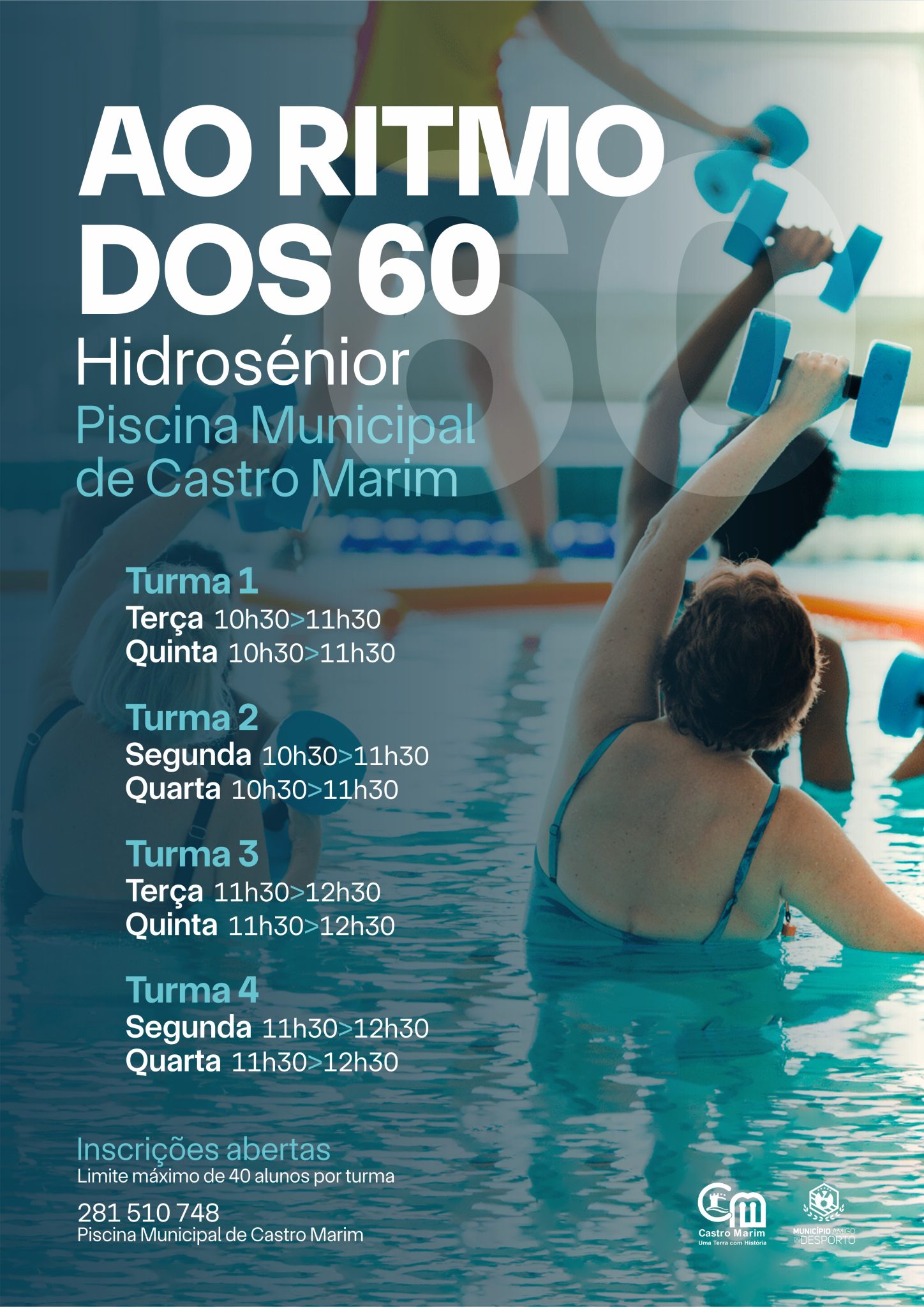 A Hidroginástica também está de regresso à Piscina Municipal de Castro Marim, destinada a todas as idades. É uma prática desportiva abrangente e adaptável a diferentes objetivos que pretende prevenir problemas de saúde ou promover a prática desportiva conjugada com um bem-estar harmonioso e o convívio.