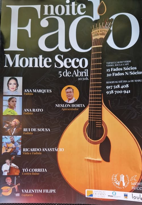Vem aí a noite de Fado no Monte Seco! No dia 5 de Abril, a partir das 20:30 horas, iremos contar com a apresentação de Neslon Horta, as fadistas Ana Marques e Ana Rato e o fadista Rui de Sousa acompanhados pelo músicos Ricardo Anastácio, Tó Correia e Valentim Filipe.