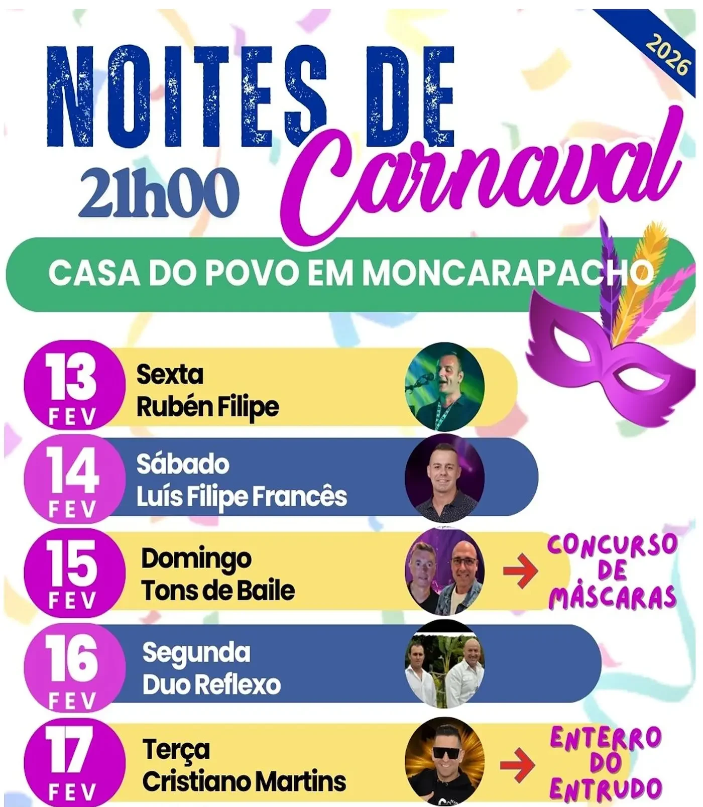 O encerramento fica a cargo de Cristiano Martins, numa noite marcada também pelo simbólico Enterro do Entrudo, momento típico que assinala o fim das celebrações carnavalescas.