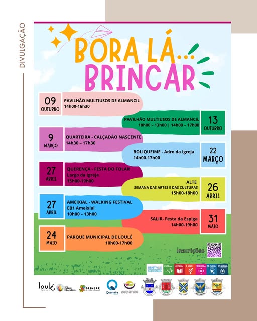 Promovido pelo grupo de trabalho “Brincar na Cidade Educadora”, que tem como objetivo incentivar o direito das crianças a brincar, esta iniciativa da Câmara Municipal de Loulé com o apoio da Junta de Freguesia de Boliqueime, vai passar no dia 22 de março, entre as 14h00 e as 17h00.