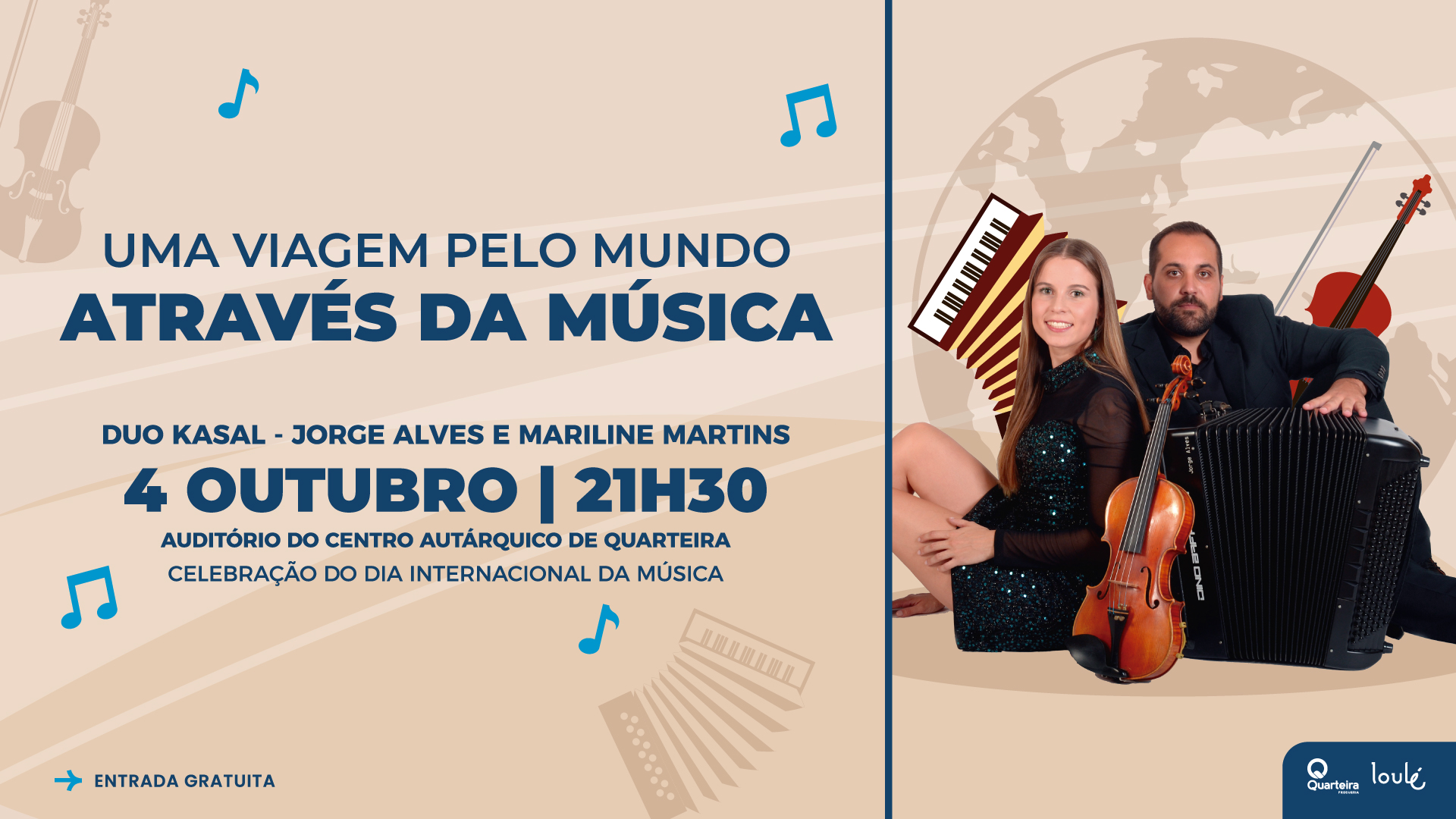 O Auditório do Centro Autárquico recebe, no dia 4 de outubro, pelas 21h30, o grupo Duo Kasal, constituído por Jorge Alves e Marilene Martins para a comemoração do Dia Internacional da Música, que se realiza no primeiro dia do mês.