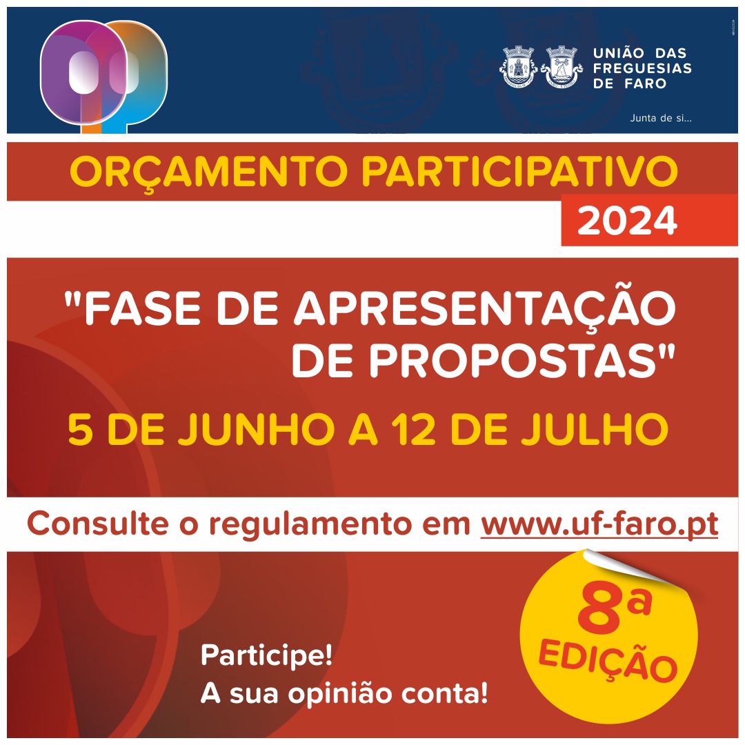 A União das Freguesias de Faro está a realizar a 8.ª edição do Orçamento Participativo (OP), um instrumento de participação cívica através do qual os cidadãos podem apresentar propostas e escolher, através do voto, quais os projetos a implementar em diferentes áreas de atuação da Junta de Freguesia.